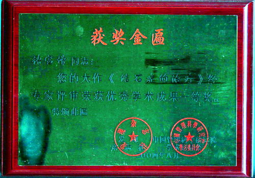 2004年6月,五絕指針療法創(chuàng)始人張寶增主任醫(yī)師的作品《結(jié)石癥的治療》,經(jīng)中國管理科學(xué)研究院專家評審,榮獲優(yōu)秀學(xué)術(shù)成果一等獎;并頒發(fā)獲獎證書及獲獎金匾。