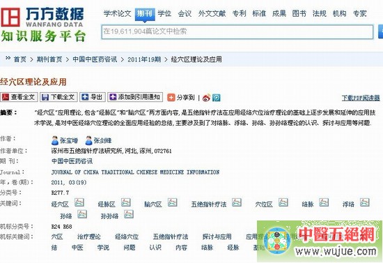 由張寶增、張劍鋒撰寫的“經穴區理論及應用”論文入刊2011年《中國中醫藥咨訊》第19期,并收錄入《中文科技期刊數據庫》,并且可在萬方數據庫中檢索到論文內容。