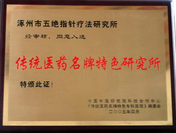 涿州市五絕指針療法研究所榮獲獎牌及證書