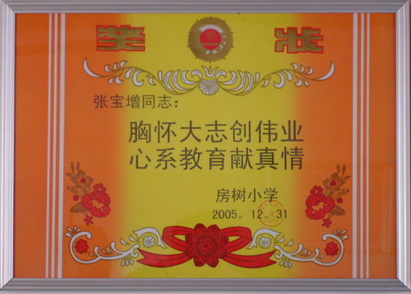 張寶增醫師在醫學上不斷地創新、進取,更熱心于教育事業的發展。涿州市松林店鎮房樹中心小學于2005年12月31日授予張寶增醫師“胸懷大志創偉業,心系教育獻真情”獎狀。
