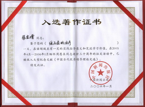 鑒于張寶增醫師撰寫的《結石癥的治療》一文在該領域具有一定的實踐指導意義和交流學習價值,在2005年4月--2006年1月緬懷周恩來同志逝世三十周年的征文活動中,已被收入由中國新聞出版社出版的大型紀念文獻《中國當代優秀領導理論文選》。