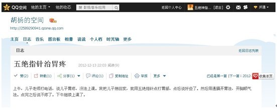 “上午,兒子老師打電話,說兒子胃疼,沒法上課。我把兒子接回家,就用五絕指針點打胃部,點后說好些了。然后用通膈開胃法,開胸順氣法。點完之后說不疼了。下午繼續上課了。”