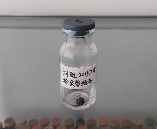 輸尿管結石圖片:這是一位輸尿管結石患者在采用五絕指針療法治療后排下的輸尿管結石標本。結石體形狀不規則,呈紅褐色,質地堅硬。