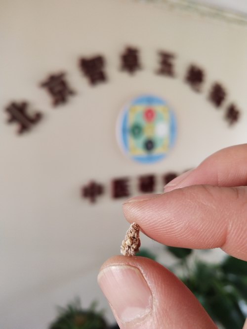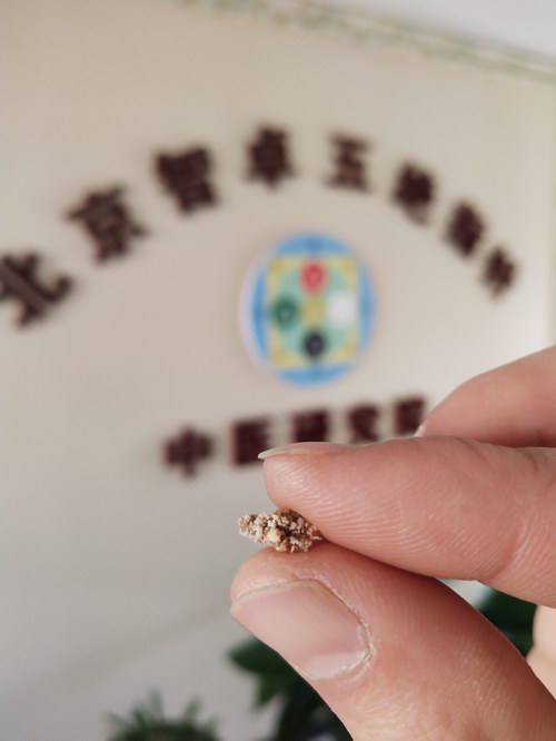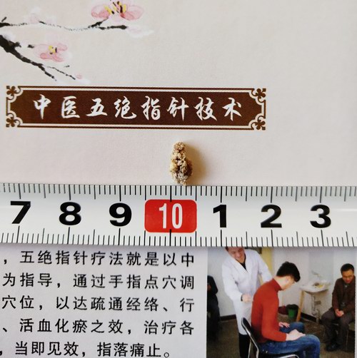 47歲女性腎結石患者,經五絕指針療法治療后排下的不規則石質,呈黃褐色,質硬,邊緣銳利,大小約9X4毫米,排出時無疼痛表現。