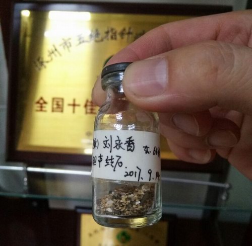 66歲的劉女士,患膽囊結石數年,間斷出現胃脘及后背部疼痛。2017年7月16日胃脘及后背部沉痛明顯,到醫院檢查示:膽囊多發結石,最大者0.6厘米。2017年7月19日采用五絕指針療法治療膽囊結石,治療后胃脘及后背部疼痛明顯減輕,漸漸癥狀消失,飲食量也增加了;第七天時便可在大便中洗出黃色及黑色沙質,之后便間斷洗便觀察排石情況,至2017年9月14日,積攢了多種排下的沙質,有黃色膽固醇型的、有黑色膽紅素型的,裝了少半瓶。
