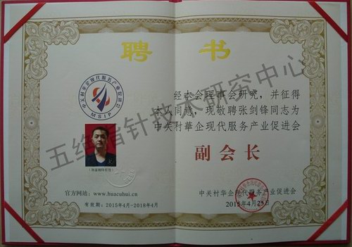 2015年4月,五絕指針技術傳承人張劍鋒,受聘為中關村華企現代服務產業促進會副會長;并經中關村華企現代服務產業促進會理事會決定,受任為中關村華企現代服務產業促進會五絕指針技術研究中心主任,主持中關村華企現代服務產業促進會五絕指針技術研究中心日常工作。